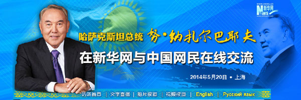 ??? 新華網上海5月20日電 哈薩克斯坦總統納扎爾巴耶夫20日接受新華網獨家訪談與中國網民在線交流,回答中國網民的問題。