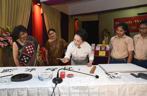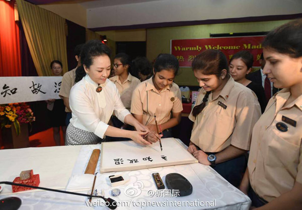 ????新華網(wǎng)北京9月18日電 據(jù)新華社“新國際”微博報道,習近平主席夫人彭麗媛18日上午在新德里參觀泰戈爾國際學校時,用毛筆書寫成語“溫故知新”,并簽名蓋上印章。她對師生們逐字講解后說,我們要經(jīng)常溫習學過的知識,不斷學習掌握新知識,開拓創(chuàng)新,與時俱進。希望同學們認真學習,更好報效祖國,祝你們成功。