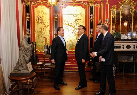 夕陽西下,秋意闌珊。梅德韋杰夫早早在官邸門口迎候克強總理,并請他來到金碧輝煌的“中國廳”用餐。