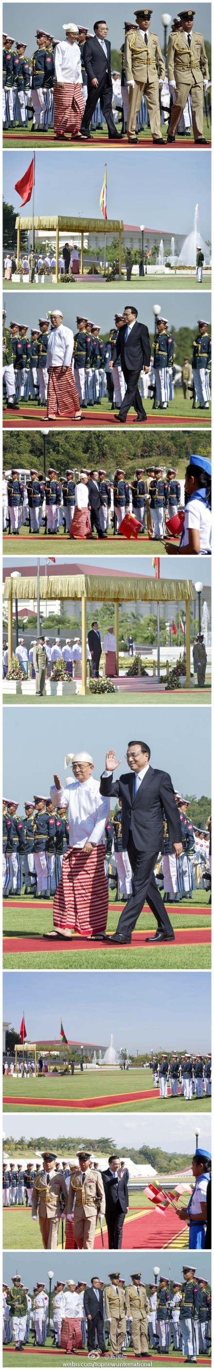 ??? 新華網北京11月14日電 據新華社“新國際”微博報道,緬甸總統吳登盛14日在內比都總統府前廣場舉行隆重儀式,歡迎中國國務院總理李克強對緬甸進行正式訪問。這是李克強就任總理以來首次訪問緬甸。
