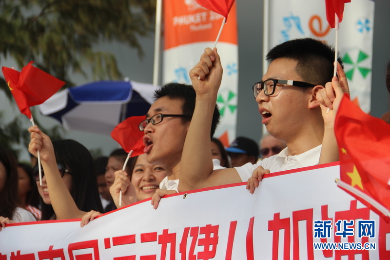 ??? 11月16日,普吉孔子學(xué)院的中國志愿者老師們?yōu)橹袊\動健兒加油。中國體育代表團16日在泰國普吉舉行的第四屆亞洲沙灘運動會上勇奪2枚金牌和2枚銅牌。當(dāng)天比賽全部結(jié)束時,中國隊以3金2銀5銅的成績暫列獎牌榜第五,東道主泰國隊以9金11銀12銅的成績暫列金牌榜和獎牌榜第一。新華社記者楊云燕攝