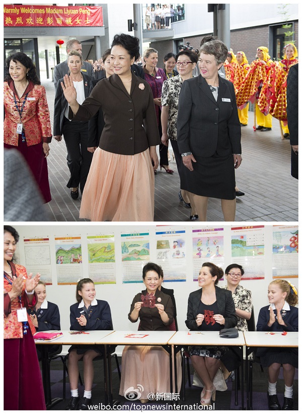??? 新華網(wǎng)北京11月19日電 據(jù)新華社“新國際”微博報道,習近平主席夫人彭麗媛19日在悉尼參觀育文武女子學校,在舞龍隊引導下來到孔子課堂?!鞍兹找郎奖M……”16名女孩朗誦《登鸛雀樓》,還學打中國結、制作剪紙、繡織漢字“中澳友誼長存”。彭麗媛拿起剪刀,剪出一個“福”字。?