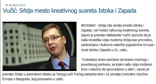 ????塞爾維亞總理武契奇14日在塞爾維亞南通社發表題為《塞爾維亞是東西方創造性相遇的地方》的署名文章。文章稱,塞爾維亞不是夾在東西方之間的國家,而是東西方創造性相遇的地方。他表示,一個現代化的塞爾維亞(應)成為東部歐洲經濟、交通、文化的交叉點以及21世紀東西方的橋梁。他說,中國是強大的和值得信賴的伙伴,通過同中國的合作,塞爾維亞可以很快、堅定地去實施自己的戰略預想。武契奇還引用《孫子兵法》作者孫武的話“如果你善于利用機會,機會會增加”,表示賽爾維亞將緊緊抓住現在的機遇,為自己的發展創造新的機會。