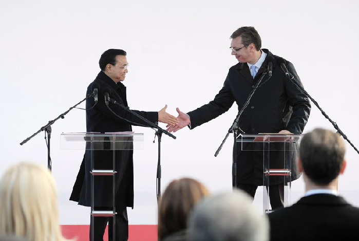 李克強(qiáng)與塞爾維亞總理武契奇共見記者。中新社 劉震 攝