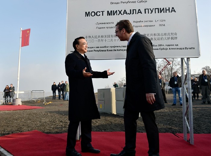 李克強(qiáng)與塞爾維亞總理武契奇出席貝爾格萊德跨多瑙河大橋竣工儀式。中新社 劉震 攝