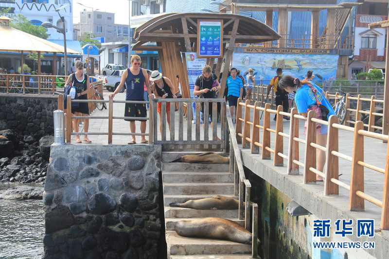 海獅三三兩兩地在圣克里斯托巴(San Cristobal)島的碼頭上休憩。