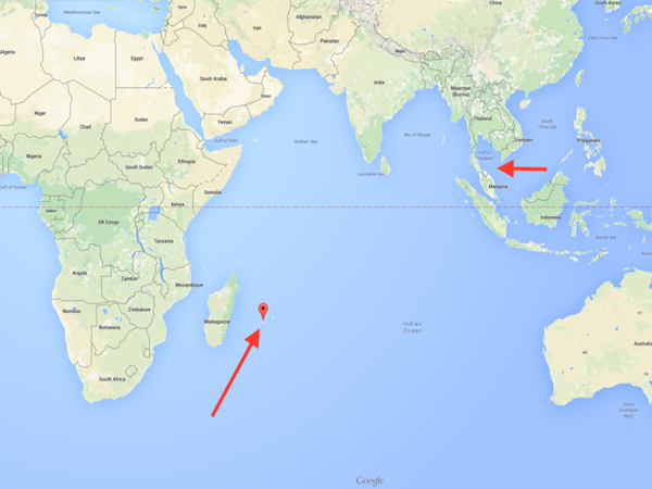 (左側箭頭是殘骸發現地,右側為MH370最后信號的發出地)