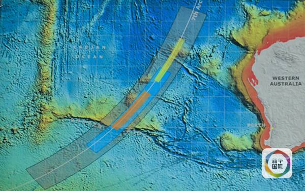 6月26日,澳方宣布,根據多國衛星專家小組對已有衛星信息進行的重新分析,MH370航班的搜尋將轉入新區域,新搜索區域位于“藍鰭金槍魚”此前搜索區域以南,距離西澳大利亞海岸約1800公里,面積約6萬平方公里,仍在根據衛星與飛機“握手”信息而確定的第七條弧線上。圖為澳方公布的新區域,橙色區域是優先級最高的搜尋區,藍色區次之。(新華社記者徐海靜攝)