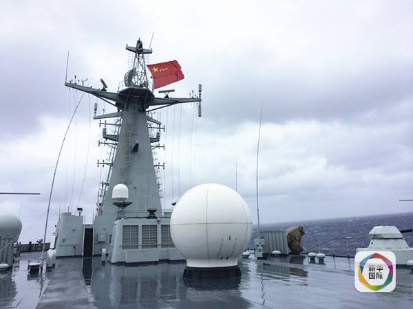 這是2014年4月23日拍攝的在風浪里堅持執行搜索任務的中國海軍井岡山艦。(新華社記者白瑞雪攝)