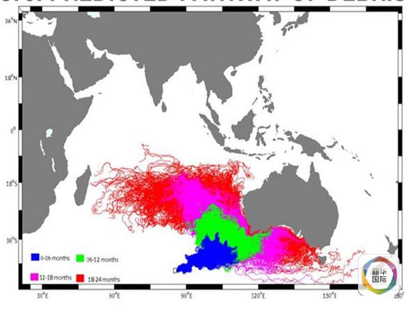 根據這個模型,MH370的殘骸可能在18-24個月出現在下圖中的紅色區域,法屬留尼汪島就在紅色區域內。