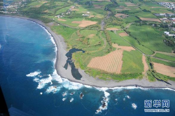 這是8月9日航拍的法屬留尼汪島東部海域和沿岸。 當日,法國政府恢復因天氣原因而暫停一天的在法屬留尼汪島東部海域的搜尋工作。 新華社記者 張川石 攝