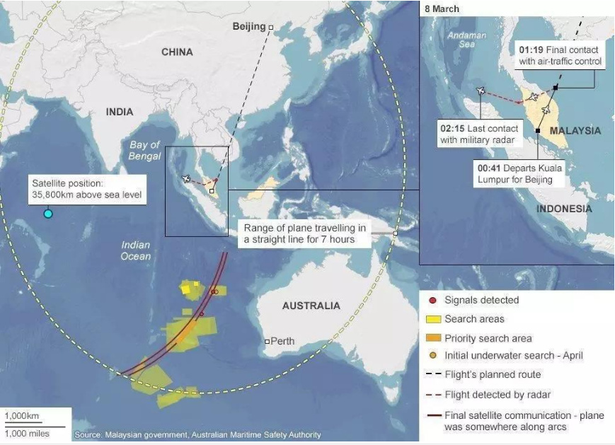 許多人還記得,MH370失去聯系后,根據飛機曾與衛星聯系的信號在印度洋東部劃出了一個12萬平方公里的搜尋區,那為什么現在殘骸又出現在了數千公里外、印度洋西南部的留尼汪島?