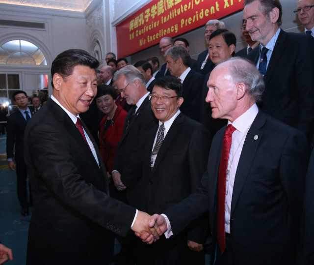 習近平指出,近年來,孔子學院在英國快速發展。目前,英國已經建立起29所孔子學院和126個孔子課堂,數量居歐洲之首。全英孔子學院取得的碩果也是中英人文交流蓬勃發展的縮影。通過人文交流,中英兩國文化中的精華正在對兩國人民的思維方式和生活方式產生著奇妙的“化學反應”。“為之不厭,誨人不倦?!毕M谧魑唤處熢俳釉賲?,為中英友好事業添磚加瓦。希望孔子學院繼續秉承“相互尊重、友好協商、平等互利”的校訓,為傳播文化、溝通心靈、促進世界文明多樣性作出新的更大貢獻。