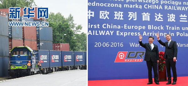 6月20日,國家主席習近平同波蘭總統杜達在華沙共同出席統一品牌中歐班列首達歐洲(波蘭)儀式。左圖:帶有統一標識的中歐班列鳴笛緩緩駛入站臺;右圖:兩國元首向班列揮手致意(拼版照片)。新華社記者 謝環馳 蘭紅光 攝