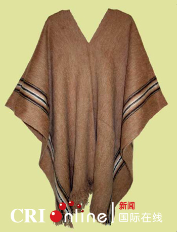 ????彭丘是用羊駝毛織成的披風(fēng),面料質(zhì)地十分細(xì)膩,胸口開V字領(lǐng),形狀像長方形的毛毯,兩側(cè)的擺有黑白相間的傳統(tǒng)花邊。顏色采取深棕色,披在身上呈寬松的倒三角廓形,傳統(tǒng)花邊的點綴極具地域特色。