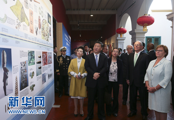 閉幕式后,習近平和彭麗媛同庫琴斯基夫婦共同參觀“天涯若比鄰-華夏瑰寶展”。