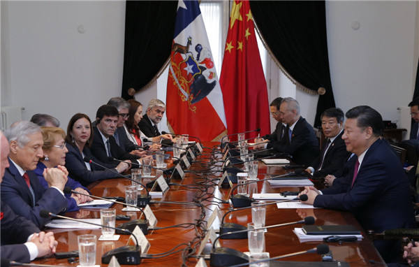 11月22日,國家主席習近平在圣地亞哥同智利總統巴切萊特舉行會談。(新華社記者 鞠鵬 攝)