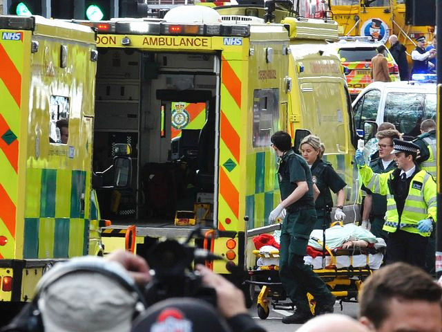 3月22日,倫敦議會大廈外,救援人員將一名傷者推向救護車。(新華/法新)