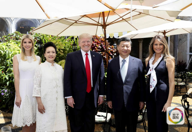 當地時間4月7日,國家主席習近平在美國佛羅里達州海湖莊園同美國總統特朗普舉行中美元首第二場正式會晤。這是習近平和夫人彭麗媛同特朗普和夫人梅拉尼婭、女兒伊萬卡在莊園內合影。(新華社記者蘭紅光攝)