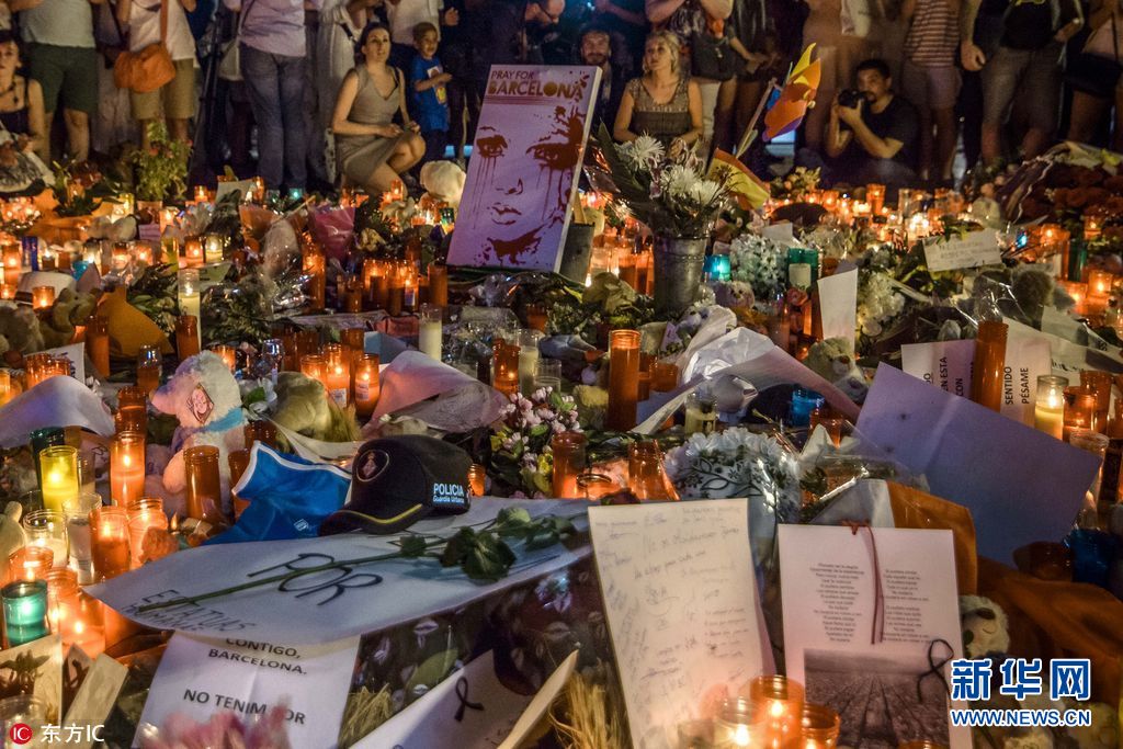 當?shù)貢r間2017年8月18日,西班牙巴塞羅那,當?shù)孛癖婞c燭獻花悼念恐襲事件遇難者。17日,一輛白色貨車在巴塞羅那市中心蘭布拉大道加泰羅尼亞廣場附近沖撞人群,據(jù)媒體報道,死亡人數(shù)已經(jīng)升至14人。(圖片來源:東方IC)