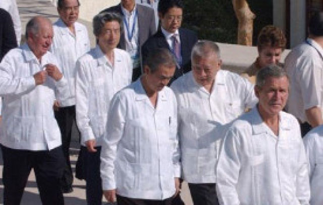 時(shí)任印尼總統(tǒng)蘇哈托贈(zèng)送每位領(lǐng)導(dǎo)人一件巴提克——一種蠟染印花襯衣。