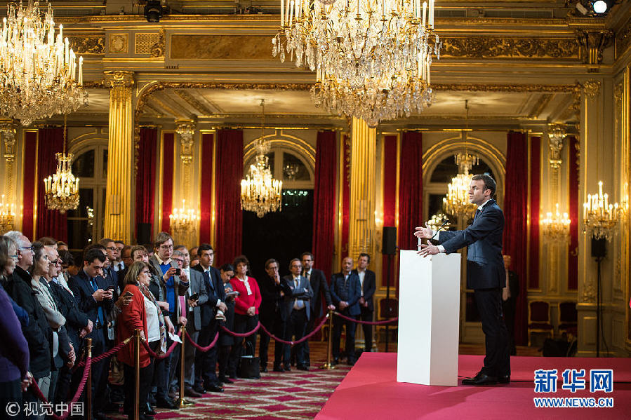 1月3日,法國總統馬克龍在愛麗舍宮向記者團送上新年祝福。(圖片來源:視覺中國)
