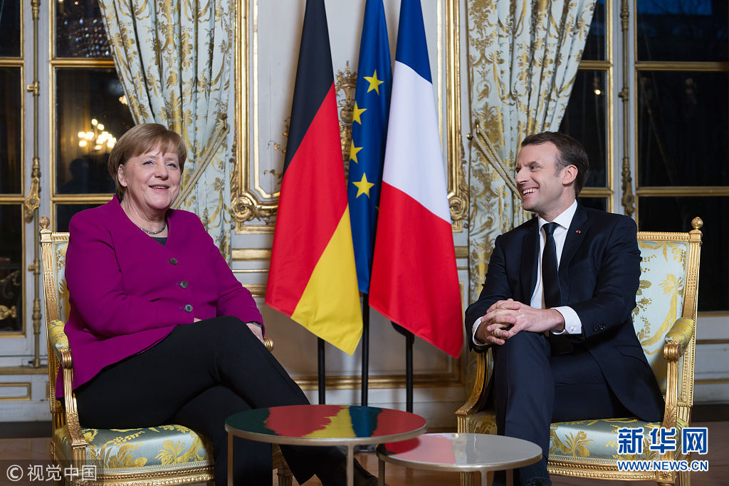 當地時間2018年1月19日,法國巴黎,法國總統馬克龍在愛麗舍宮會晤到訪的德國總理默克爾,表示在推動歐洲改革的進程中,法國需要德國。馬克龍以此對面臨大選后組閣危機的默克爾表達支持。馬克龍在會后強調了法德合作的重要性。他表示,法國無法單獨實現自身的抱負,需要與德國的抱負結合起來。