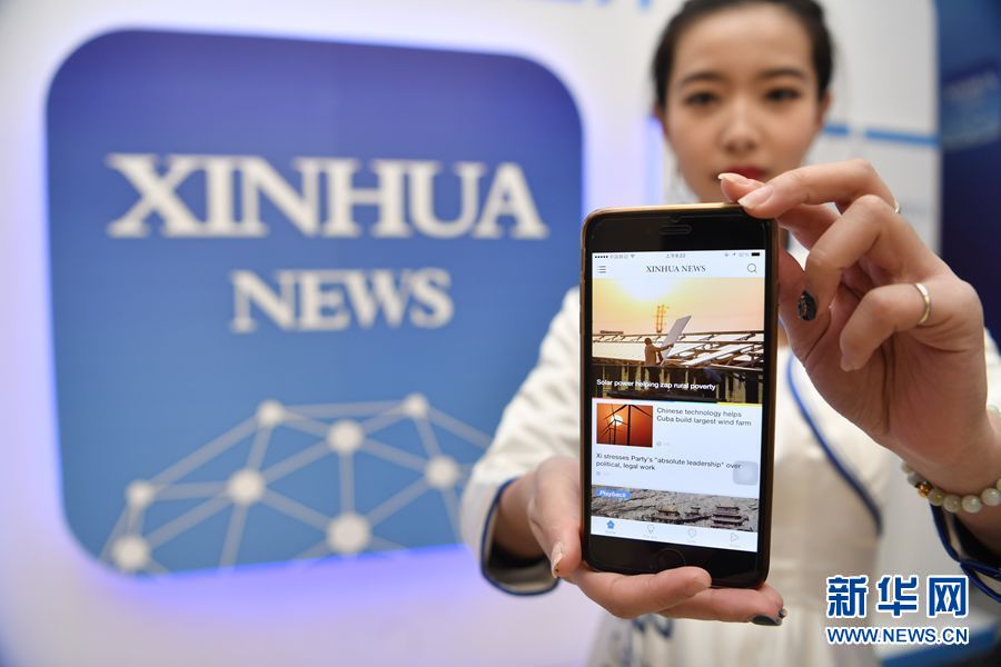 1月23日上午10:00,新華社英文客戶端上線發布會在總社大廈多功能廳舉行。圖為工作人員展示新華社英文客戶端。新華社記者 金良快攝