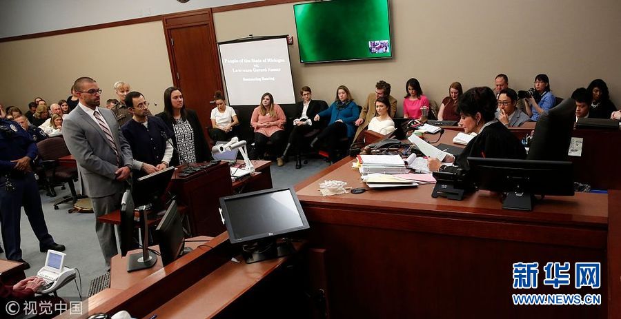 1月24日,美國密歇根州蘭辛,美國奧運體操隊前隊醫拉里·納沙因性侵被判處40-175年監禁。過去7天,超過150名女性向法官證實,自己曾是納沙的性侵對象,其中包括多名兒童。在法院宣讀的一份聲明中,納沙表示自己對受害者的歉意已“超出言語的表達范圍”。54歲的納沙1996年至2015年間在美國體操協會擔任醫師。(圖片來源:視覺中國)