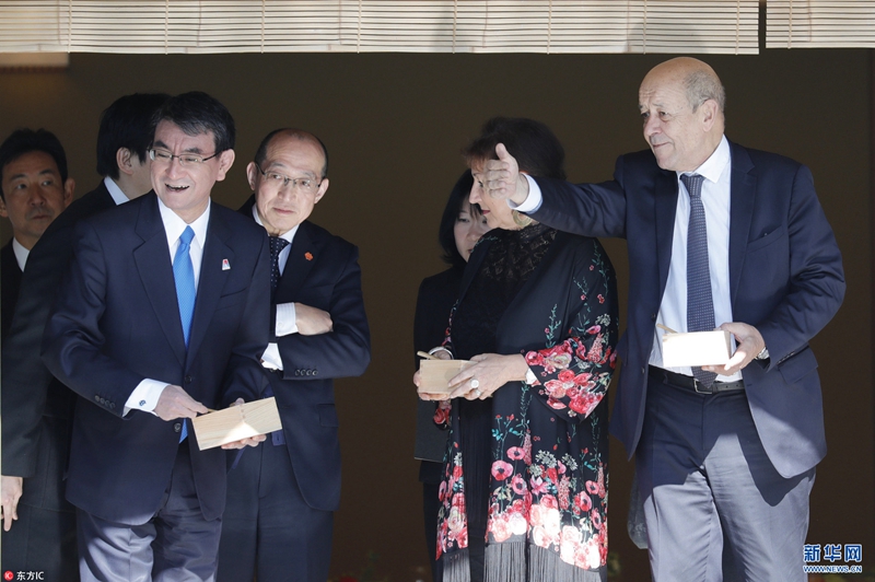 當地時間2018年1月27日,日本東京,日本外相河野太郎接待到訪的法國外長讓·伊夫·勒德里昂及其夫人,帶其參觀赤坂宮,體驗喂魚。(圖片來源:東方ic)