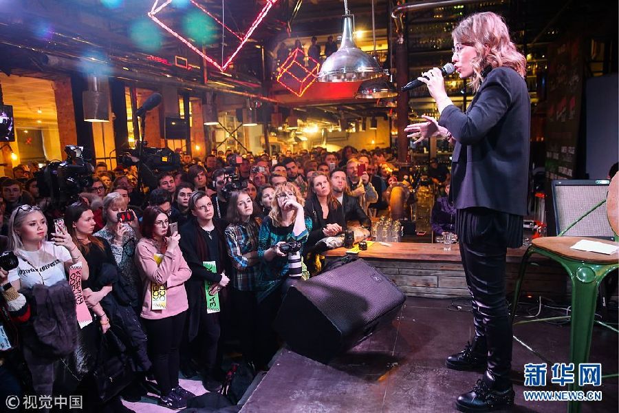 當地時間2月3日,俄羅斯圣彼得堡,俄羅斯電視節目主持人、總統候選人克謝尼婭·索布恰克會見支持者。(圖片來源:視覺中國)