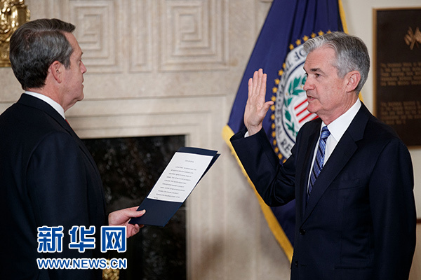 2月5日,杰羅姆·鮑威爾(右)在華盛頓宣誓就任新一屆美國聯(lián)邦儲(chǔ)備委員會(huì)主席。 新華社發(fā)(沈霆 攝)
