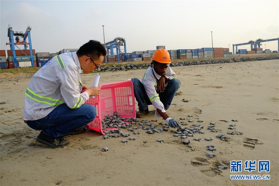每年10月至次年3月是加納海域海龜的產卵與孵化期,成年海龜會陸續來到海灘產卵,繁衍下一代。為了保障項目工程區域海龜正常產卵孵化,承建單位中國港灣工程有限責任公司(中國港灣)2017年11月建立了海龜孵化基地,將野生海龜在沿岸產的卵收集起來進行集中孵化,在小海龜孵化后放回大海。