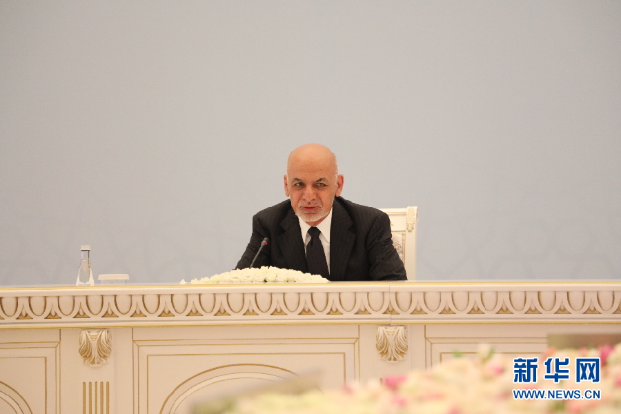 阿富汗總統(tǒng)加尼在會(huì)議上發(fā)言。阿富汗問題高級別會(huì)議27日在烏茲別克斯坦首都塔什干舉行。新華社記者周良攝
