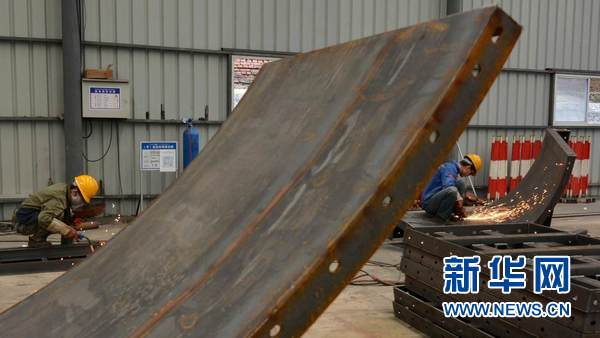 月27日,在老撾南塔省,中鐵五局工人在車間內加工鐵路施工材料。新華網發 劉艾倫攝