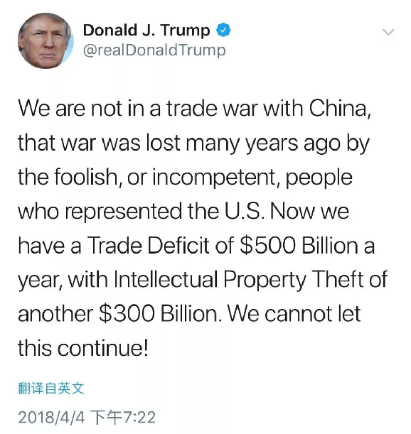 “我們沒有和中國打貿(mào)易戰(zhàn),這場戰(zhàn)爭多年前就被當時代表美國的那些愚蠢無能的人打輸了。現(xiàn)在我們一年有5000億美元的貿(mào)易逆差,另有3000億美元知識產(chǎn)權(quán)被竊。我們不能讓這一切繼續(xù)!”