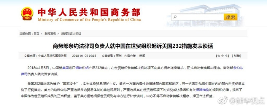 2018年4月5日,中國就美國進(jìn)口鋼鐵和鋁產(chǎn)品232措施,在世貿(mào)組織爭端解決機(jī)制項下向美方提出磋商請求,正式啟動爭端解決程序。商務(wù)部條約法律司負(fù)責(zé)人就此發(fā)表談話。