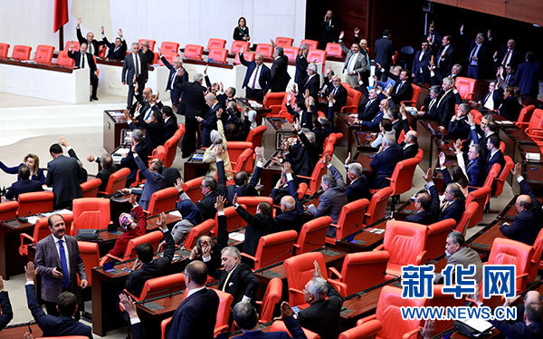 4月18日,在土耳其安卡拉,土耳其大國(guó)民議會(huì)就延長(zhǎng)緊急狀態(tài)進(jìn)行投票。新華社發(fā)