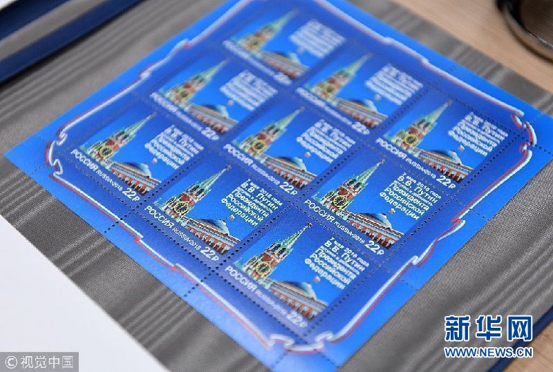 當?shù)貢r間2018年5月7日,俄羅斯莫斯科,俄羅斯發(fā)行普京就職紀念郵票。(圖片來源:視覺中國)