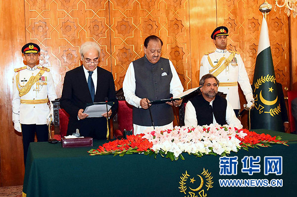 6月1日,在巴基斯坦伊斯蘭堡,納賽爾·穆爾克(前左)宣誓就任巴過渡政府總理。新華社發