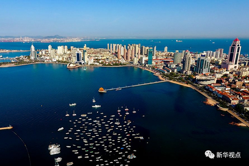 這是2018年5月4日無人機(jī)拍攝的棧橋和青島灣。新華社記者郭緒雷攝