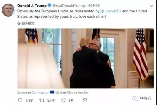 他夸耀和歐盟委員會主席容克的會晤“很溫馨”。他還在推特上貼了一張與容克“貼面禮”的照片,并這樣說:“顯而易見,容克所代表的歐盟及你們代表的美國,真的愛對方!”