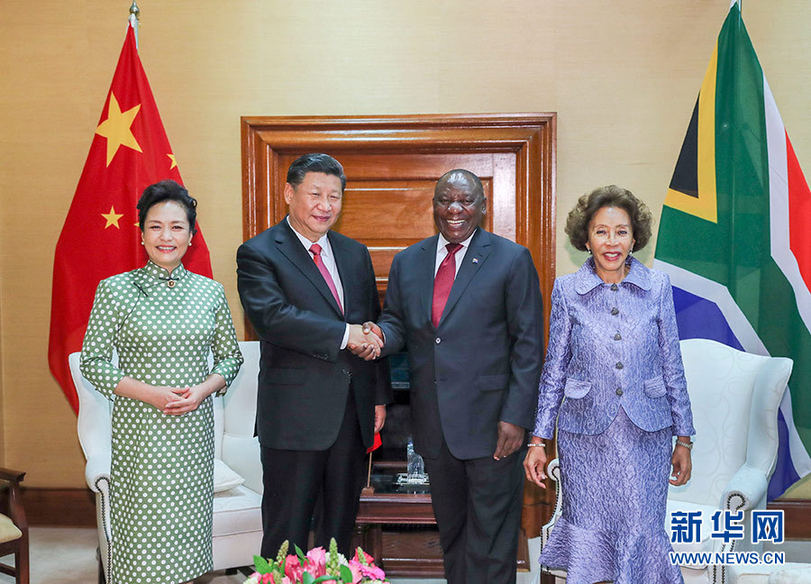 7月24日,國家主席習近平在比勒陀利亞同南非總統拉馬福薩舉行會談。這是會談前,習近平和夫人彭麗媛同拉馬福薩和夫人莫采佩合影。新華社記者謝環馳攝