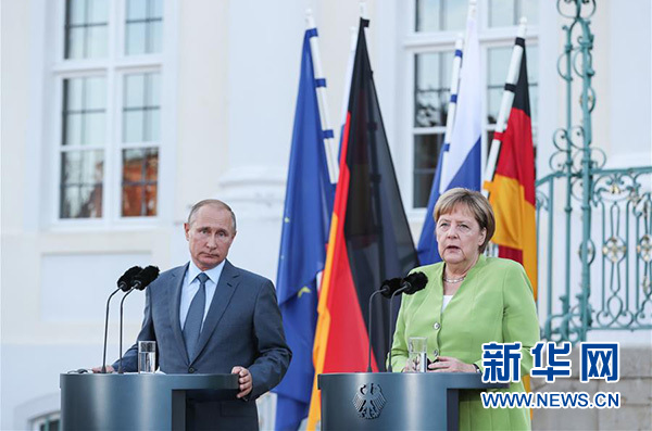 8月18日,在德國首都柏林以北小鎮梅澤貝格,德國總理默克爾(右)與來訪的俄羅斯總統普京共同出席新聞發布會。當日,德國總理默克爾在梅澤貝格與來訪的俄羅斯總統普京舉行會談,雙方就烏克蘭局勢、敘利亞沖突以及“北溪-2”天然氣管道項目等棘手問題進行討論。新華社記者 單宇琦攝