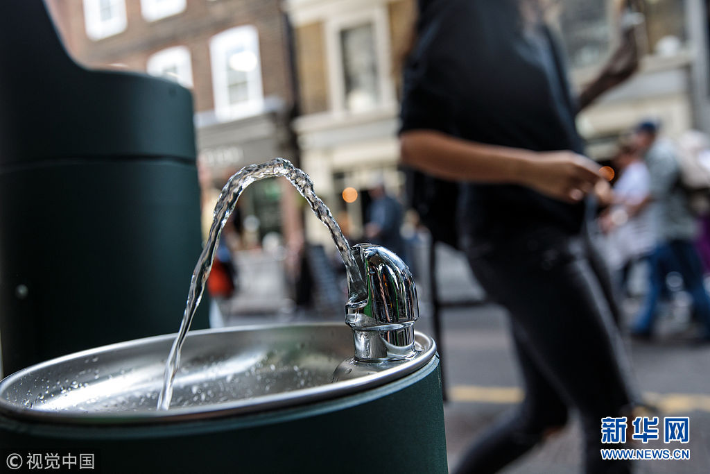 當(dāng)?shù)貢r(shí)間2018年8月28日,英國(guó)倫敦,民眾在公共飲水機(jī)旁飲水。倫敦市長(zhǎng)近日引進(jìn)了20個(gè)新的公共飲水機(jī),鼓勵(lì)人們自帶杯子取水喝,從而減少塑料垃圾。 (圖片來源:視覺中國(guó))