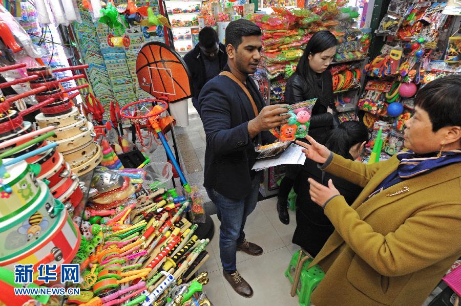 浙江義烏國際商貿(mào)城小商品經(jīng)營戶(右一)和一名非洲客商談生意(2017年1月5日攝)。 新華社記者 譚進(jìn) 攝