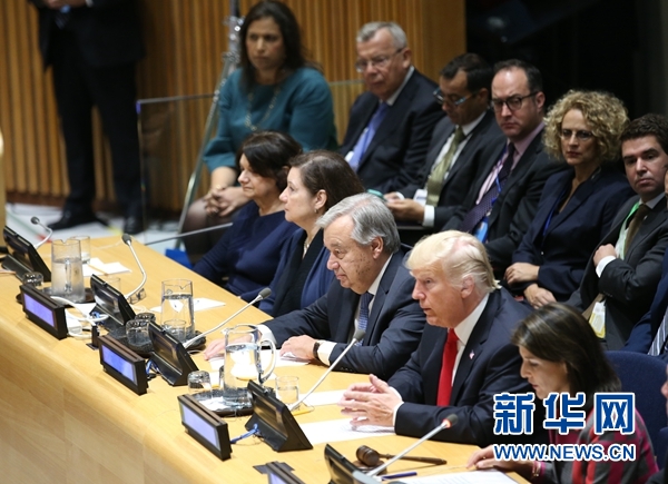 9月24日,在紐約聯合國總部,聯合國秘書長古特雷斯(前排右三)出席“呼吁全球采取行動應對世界毒品問題”高級別會議。新華社記者秦朗攝