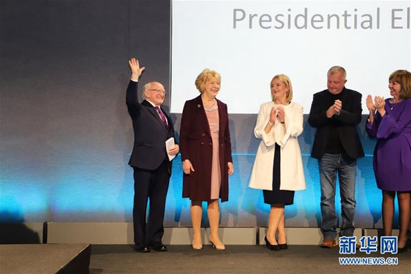 10月27日,在愛爾蘭首都都柏林,希金斯(左一)在總統選舉獲勝后向支持者致意。愛爾蘭總統選舉機構負責人27日晚宣布,愛爾蘭現任總統希金斯在26日舉行的選舉中獲勝,再次當選總統。新華社發