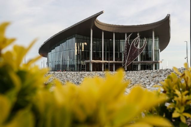 APEC大廈坐落于海濱,是此次APEC會議場館之一。主建筑造型像是巴新土著居民特有的傳統(tǒng)木舟。昔日,土著居民正是駕著這種木舟乘風(fēng)破浪,開啟周邊貿(mào)易。正門前,12米高的金屬雕塑像木舟極具辨識度的雙帆,又形似巴新國鳥天堂鳥雙翼展向空中,澳大利亞設(shè)計師以此寓意“為開啟繁榮貿(mào)易之旅揚帆”。
