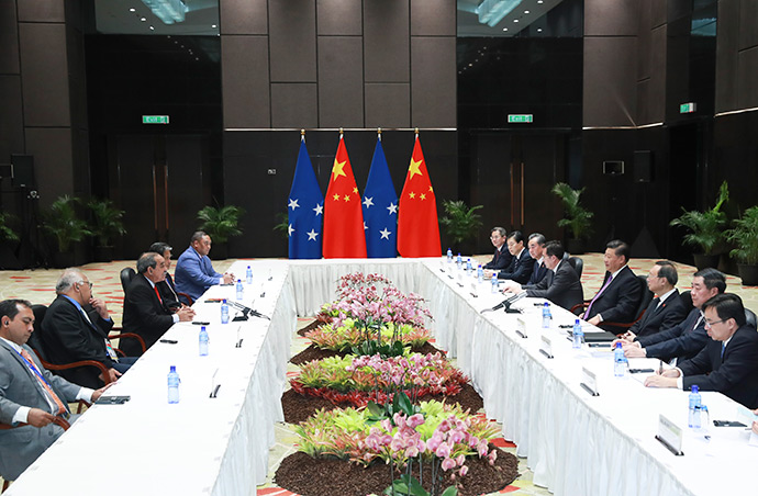 11月16日,國家主席習近平在莫爾茲比港同巴布亞新幾內亞總理奧尼爾、密克羅尼西亞聯邦總統克里斯琴、薩摩亞總理圖伊拉埃帕、瓦努阿圖總理薩爾瓦伊、庫克群島總理普納、湯加首相波希瓦、紐埃總理塔拉吉等建交太平洋島國領導人以及斐濟政府代表、國防部長昆布安博拉舉行集體會晤。習近平主持會晤并發表主旨講話。新華社記者 謝環馳 攝